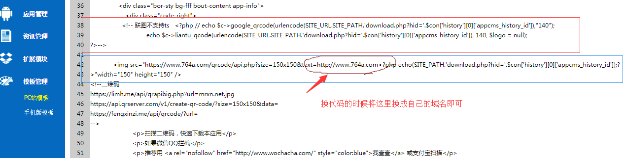 <img src="https://www.764a.com/qrcode/api.php?size=150x150&text=【修改成自己的域名 http要带着 】<?php echo(SITE_PATH.'download.php?hid='.$con['history'][0]['appcms_history_id']);?>"width="150" height="150" />